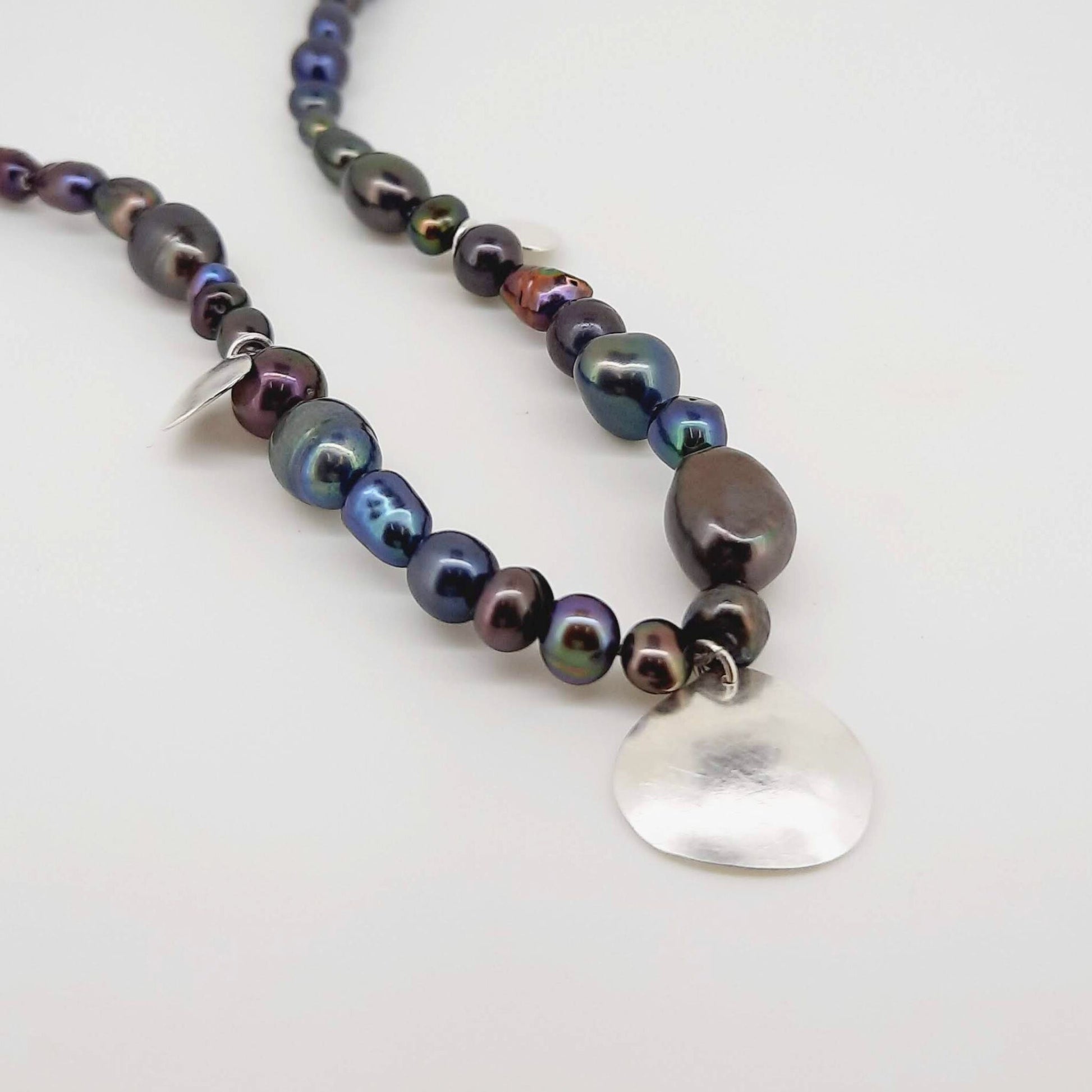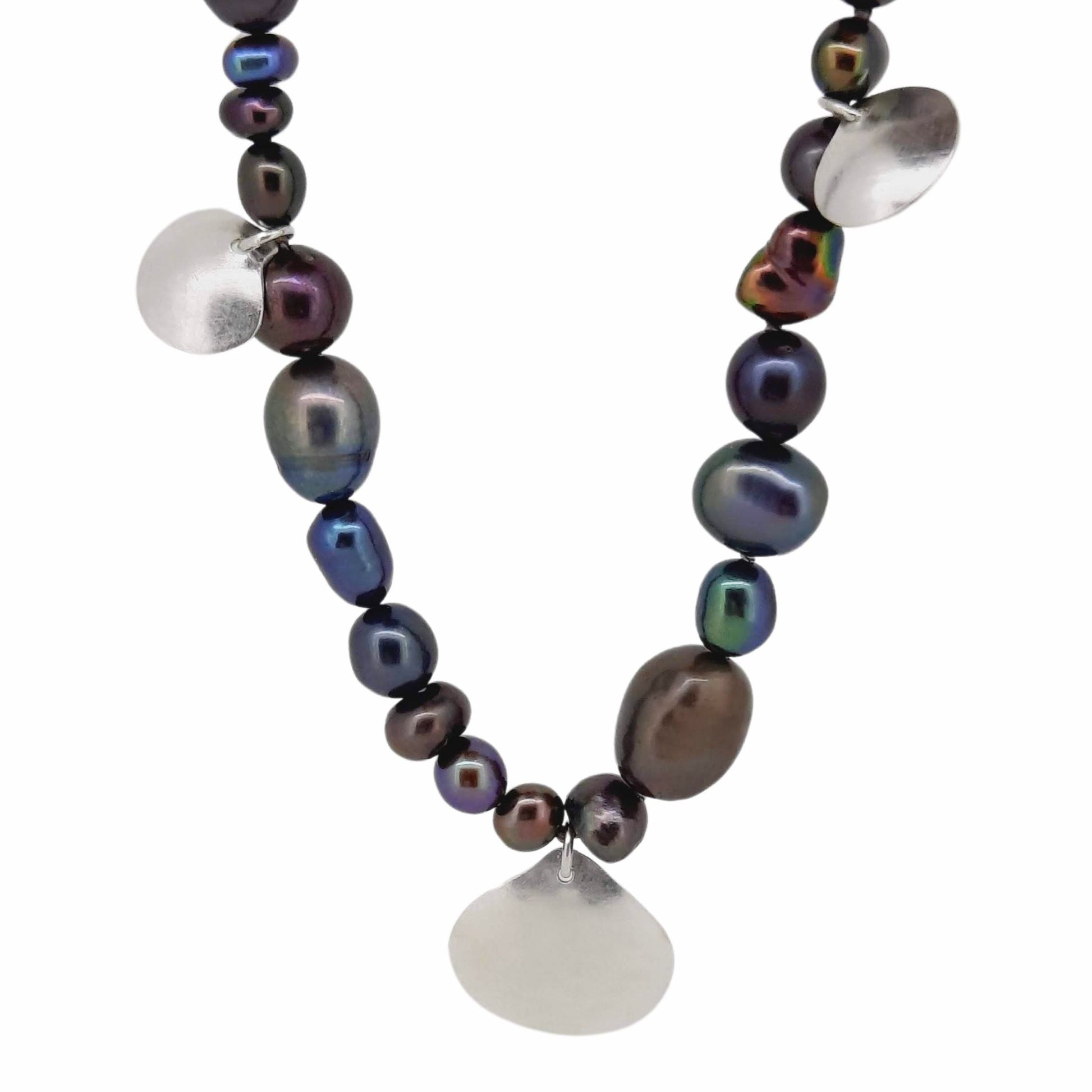 Her black Tahitian cockle necklace is handcrafted using Tahitian pearls and sterling silver.