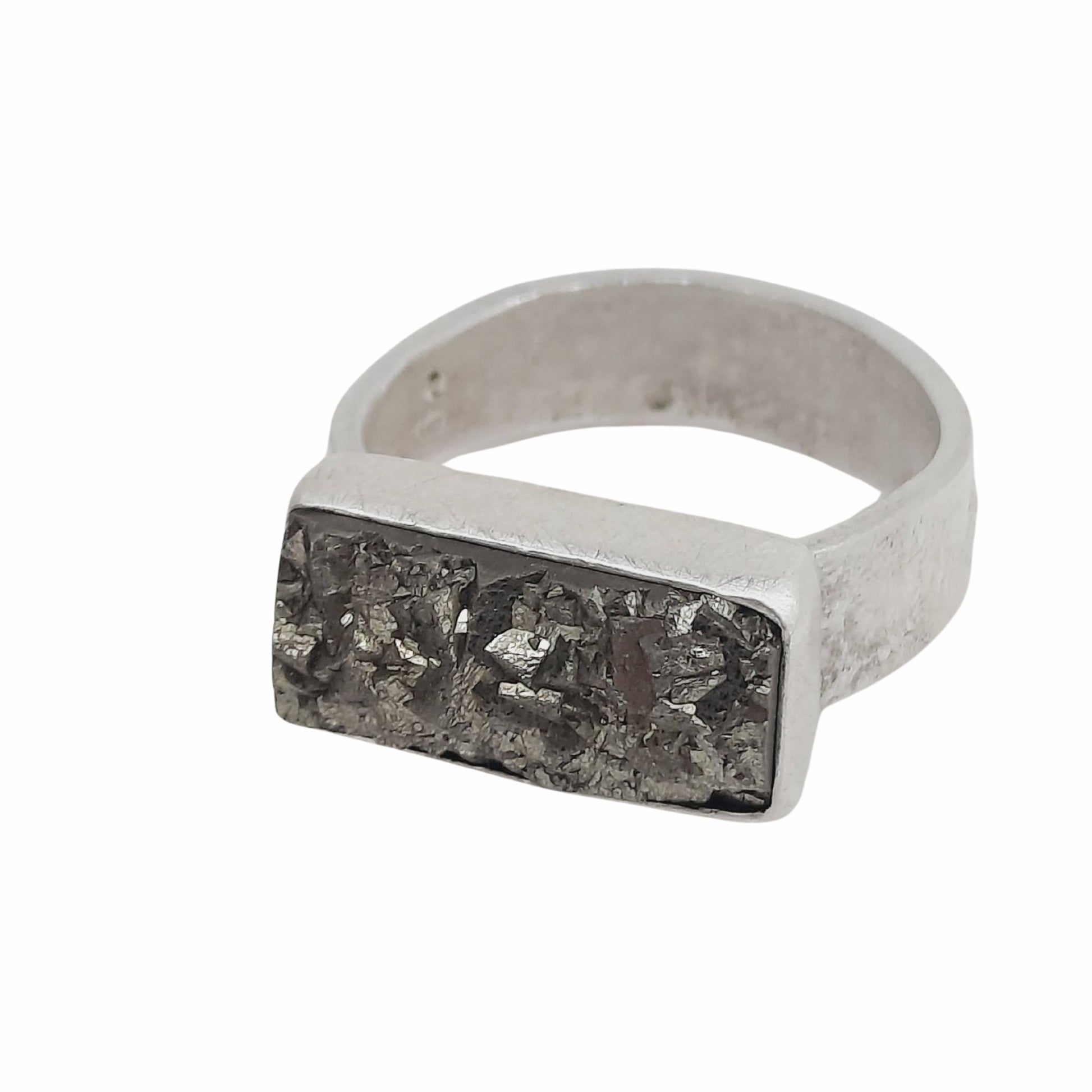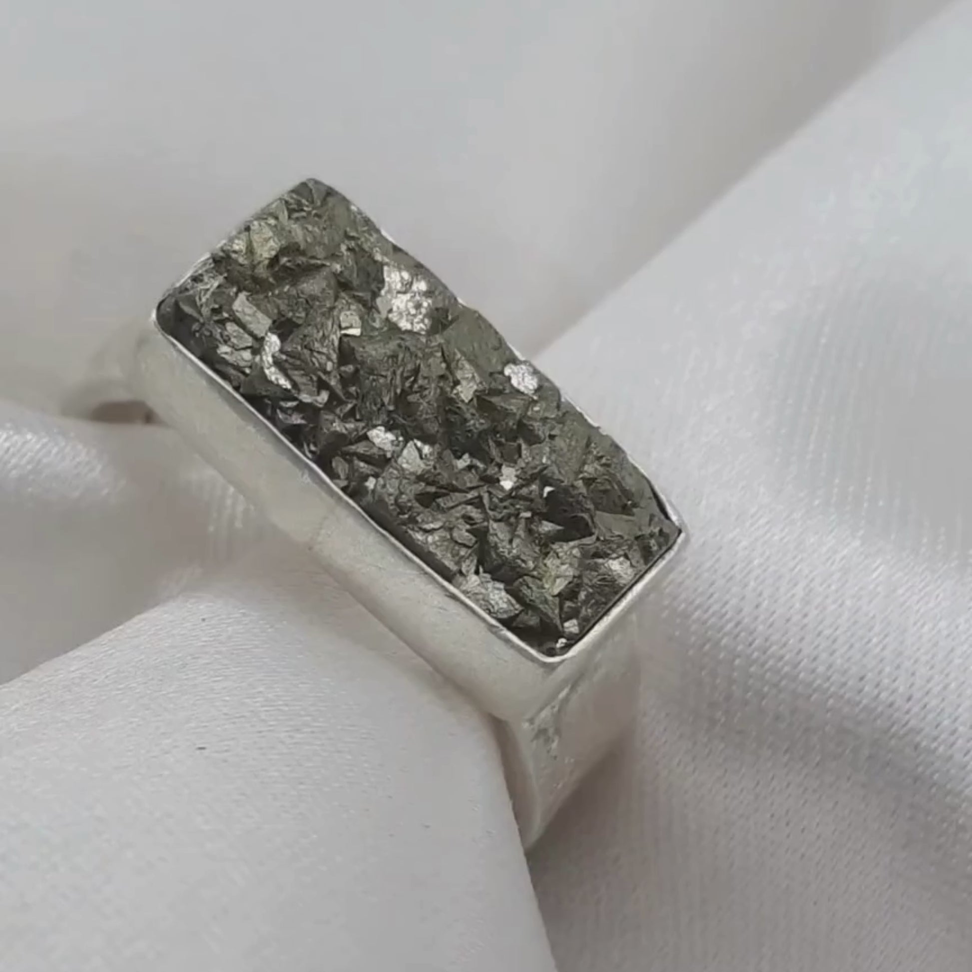 Her Moonscape ring is handcrafted from sterling silver and pyrite.