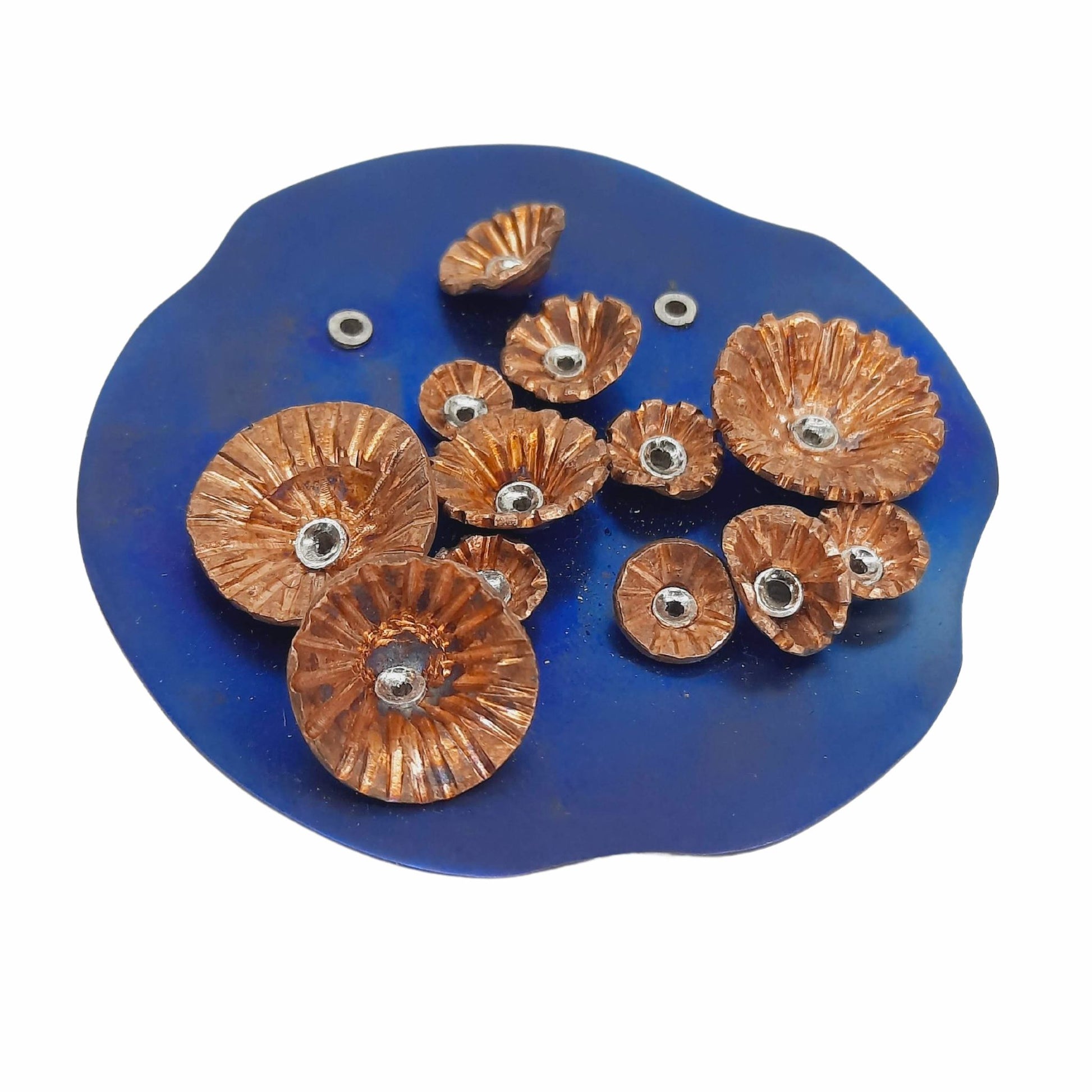 Her Bioluminescence brooch is handcrafted out of blue titanium & copper.