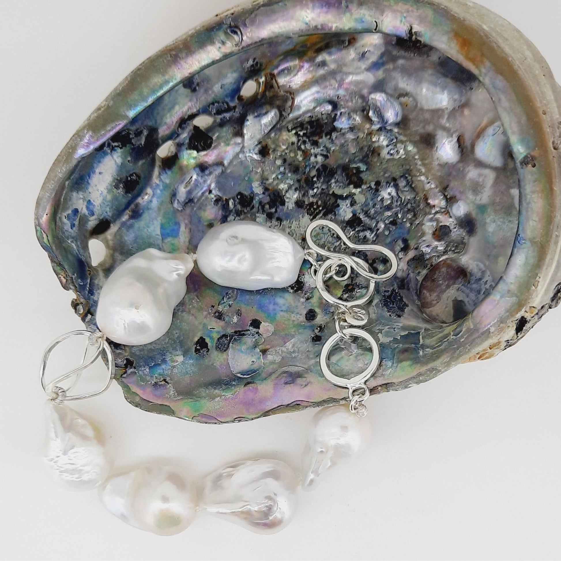 Her baroque pearl necklace is handcrafted using freshwater baroque pearls and sterling silver with an adjustable clasp.