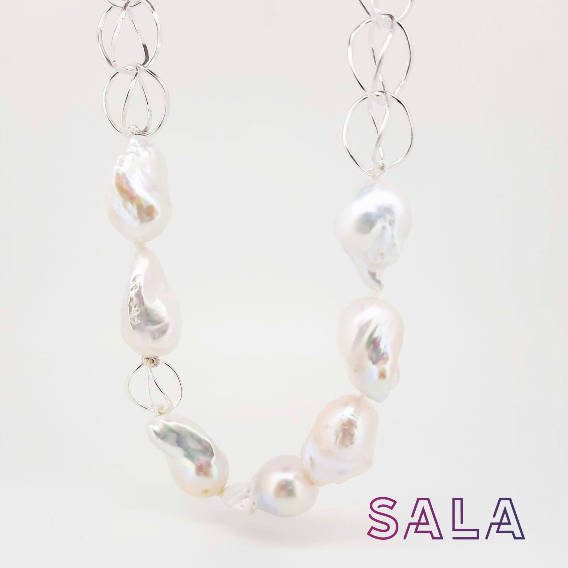 Her baroque pearl necklace is handcrafted using fresh water baroque pearls and sterling silver.