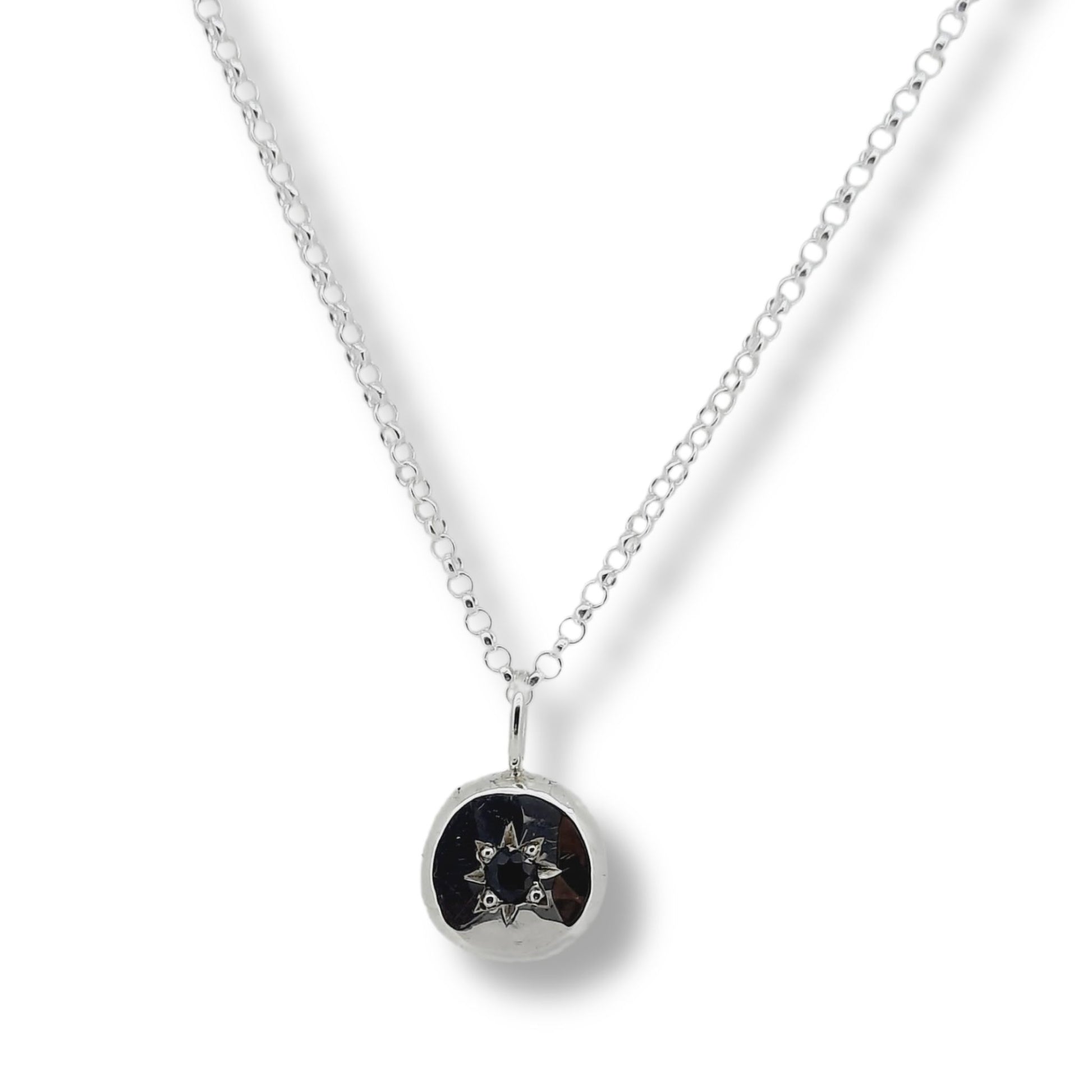 Handcrafted by Naomi Schwartz, an Australian sapphire is star set in Sterling Silver on a 45cm chain.