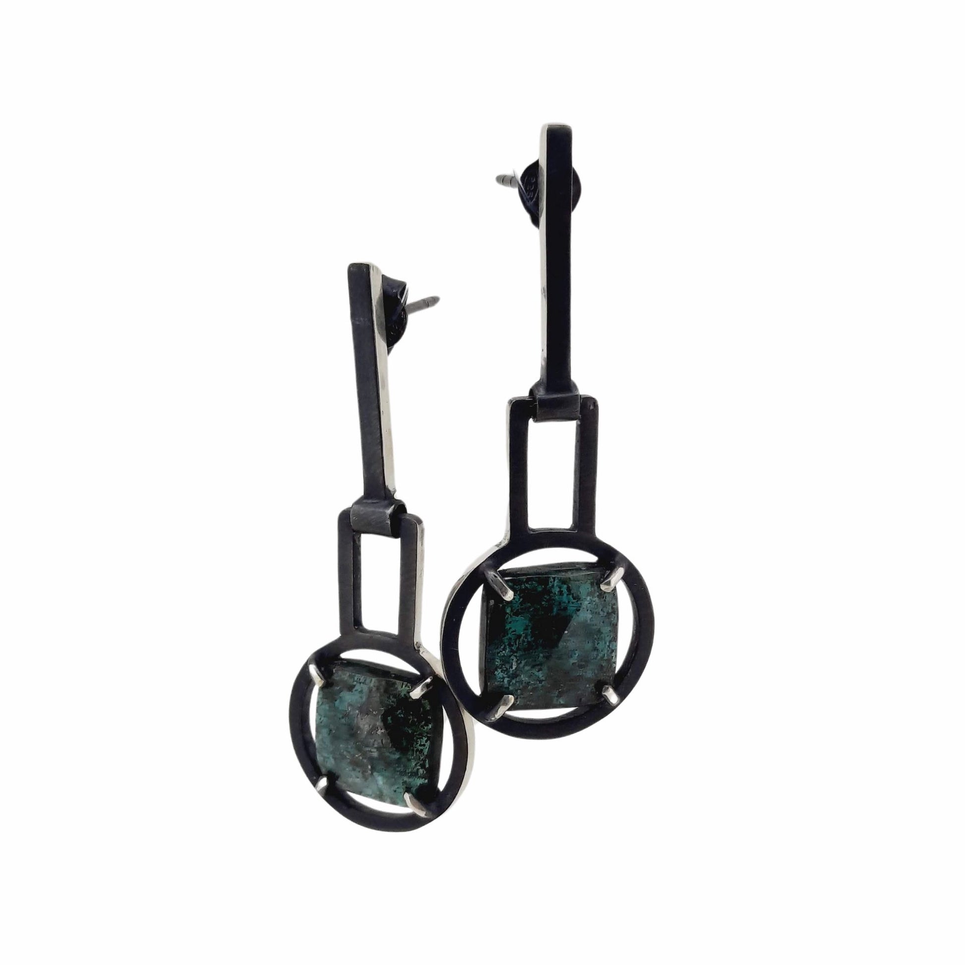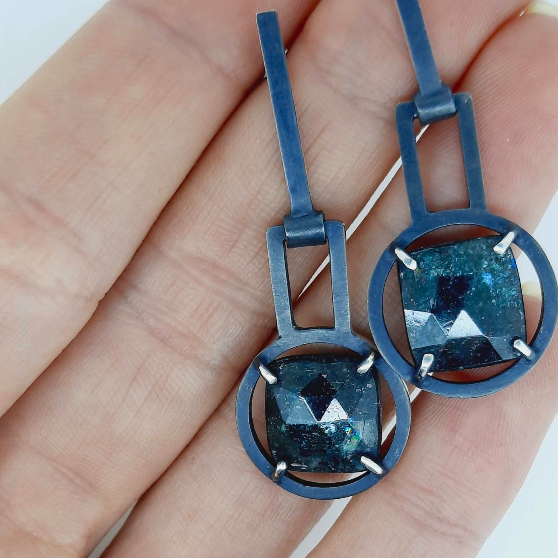 Her emerald green kyanite drop earrings are handcrafted from kyanite cabachons and blackened sterling silver.