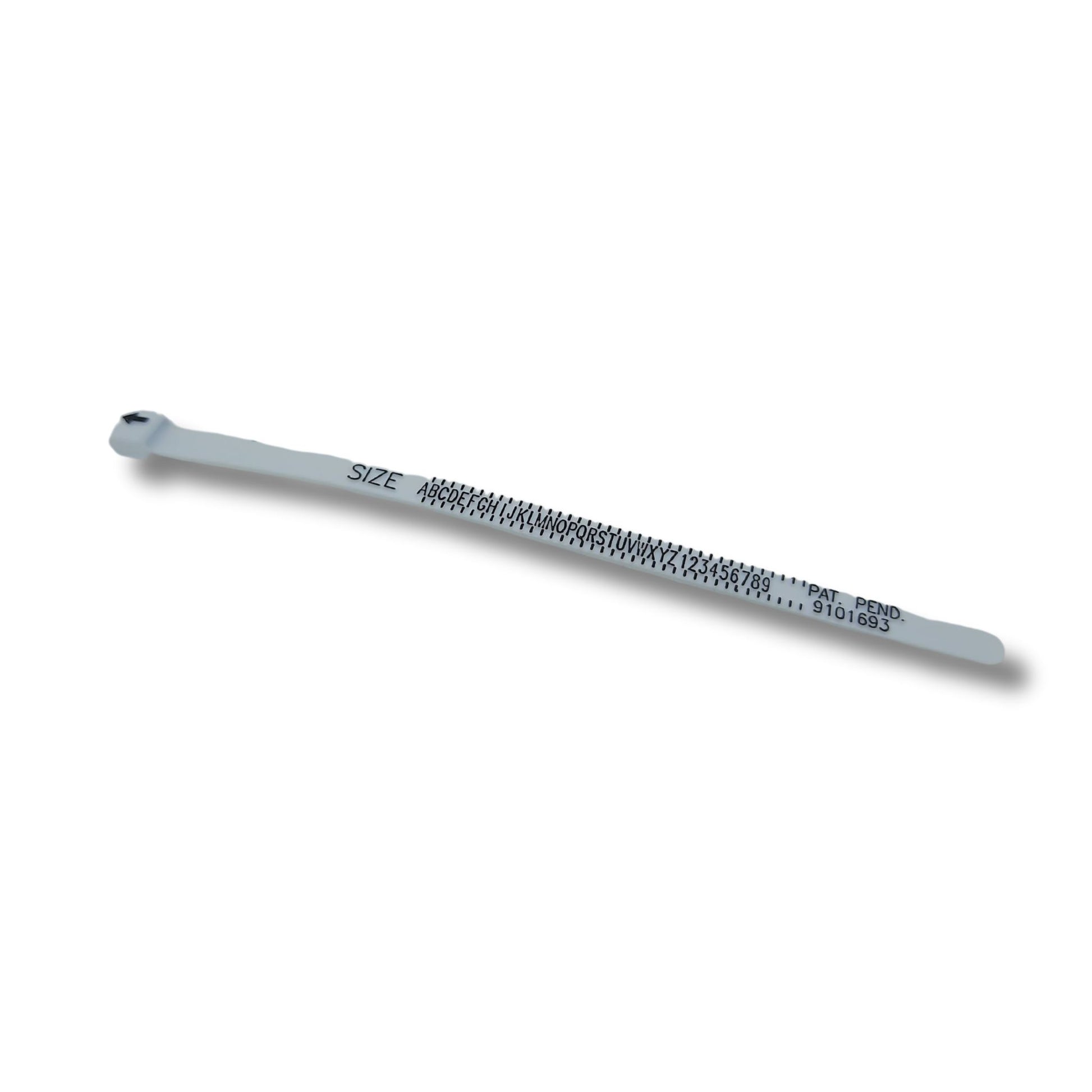 The multisizer works like a belt, simply push the end through the buckle to form a ring shape, slip it onto your finger and adjust until comfortable and there you have your ring size!