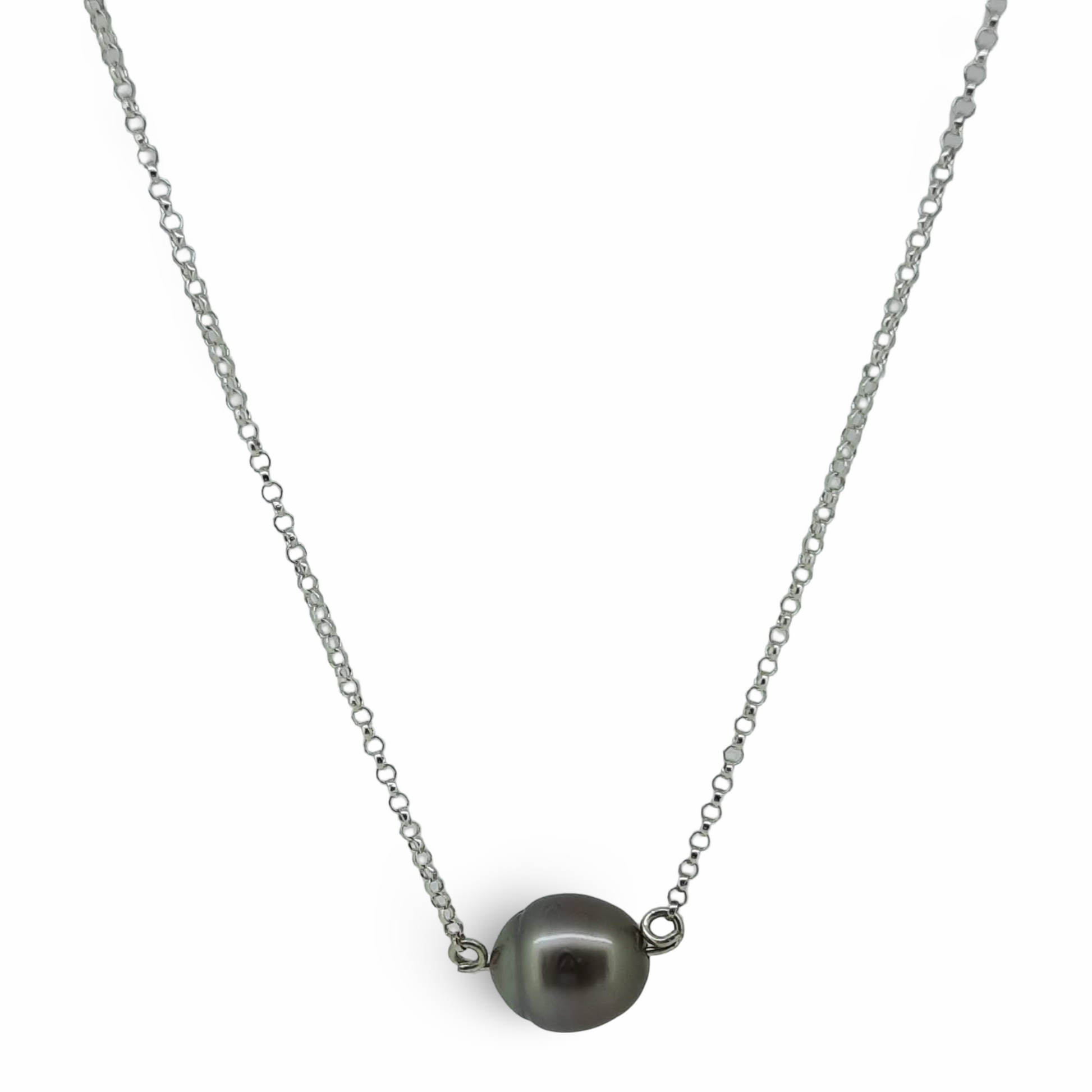 This Tahitian Pearl Pendant necklace is crafted with sterling silver and features a lustrous Tahitian pearl. With its elegant design and premium materials, this necklace is a timeless accessory that adds sophistication to any outfit. Indulge in the natural beauty of this necklace and elevate your style.