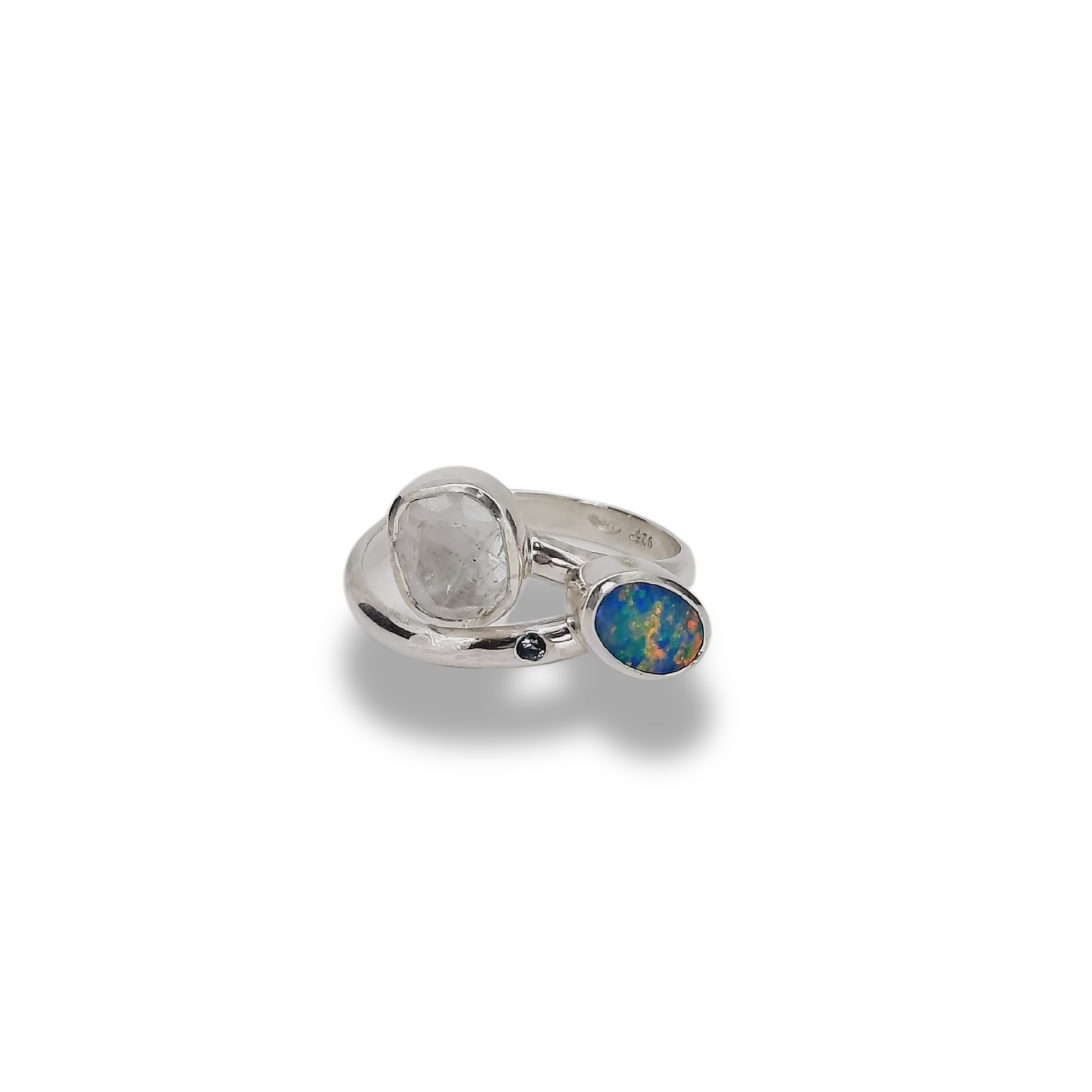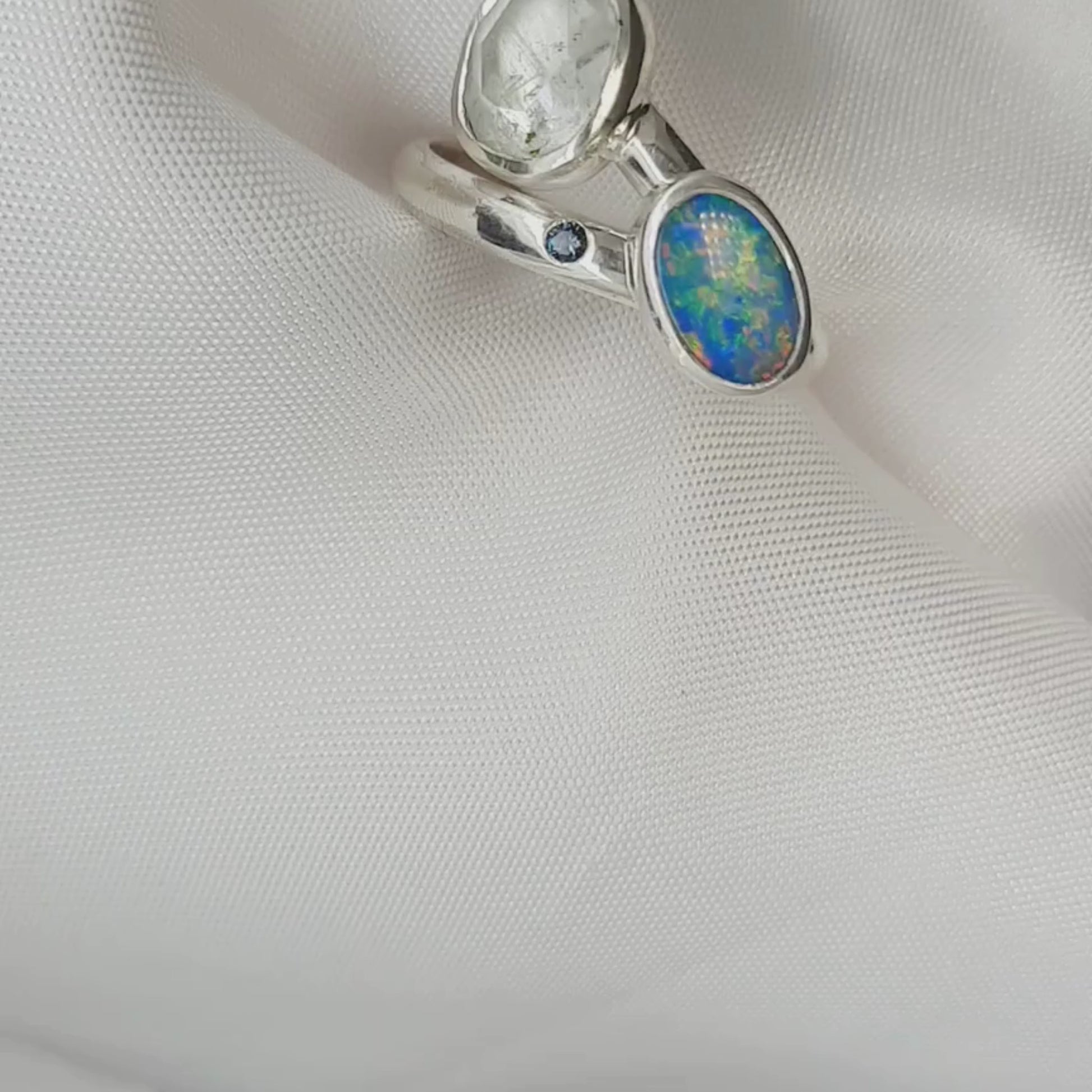 A Gorgeous Coober Pedy opal doublet, pale blue freeform Aquamarine (with natural inclusions) and a dainty London Blue Topaz all come together to create a unique design.