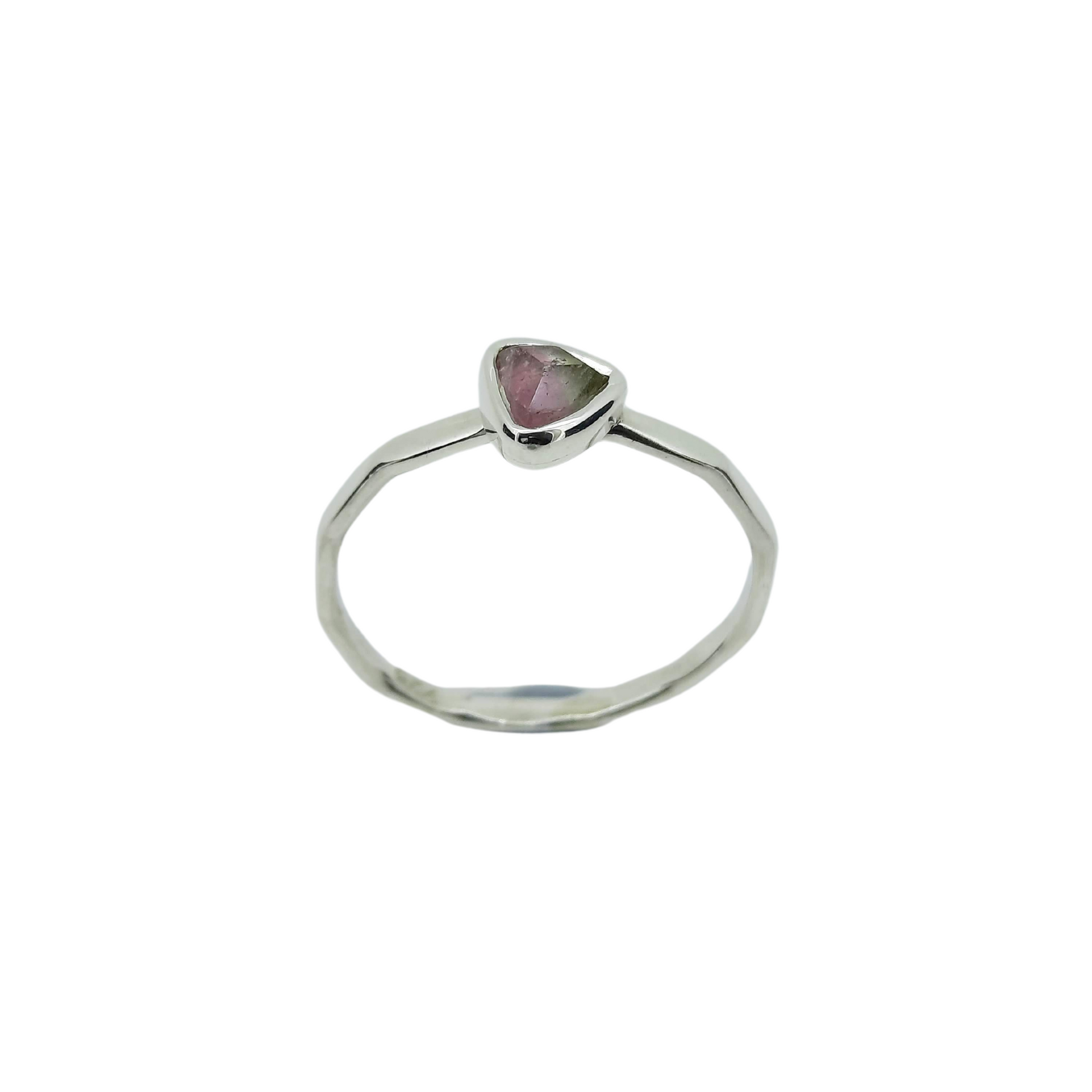A unique watermelon coloured Tourmaline has been handset in sterling silver to create this contemporary ring. A breathtaking and dainty addition to any jewellery collection.